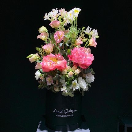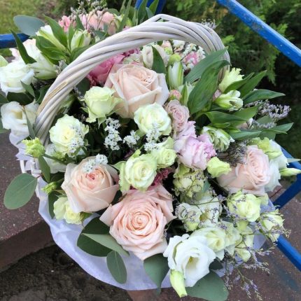 Корзина с розами, ирисами, кустовой хризантемой, альстромерией и лимониумом “Виноградная лоза”