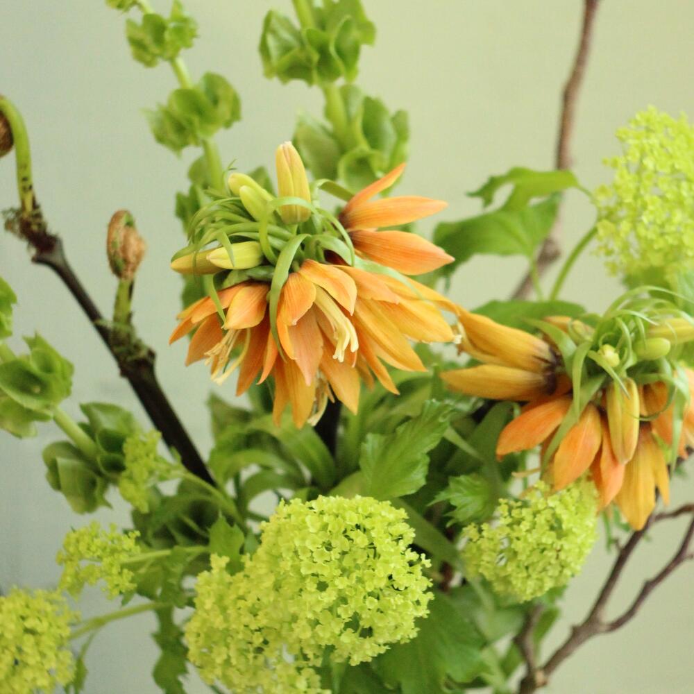 Неординарный букет с рябчиками, ирландскими колокольчиками, корягами, папоротником и вибурнумом.Стильное цветочное решение для любого случая.