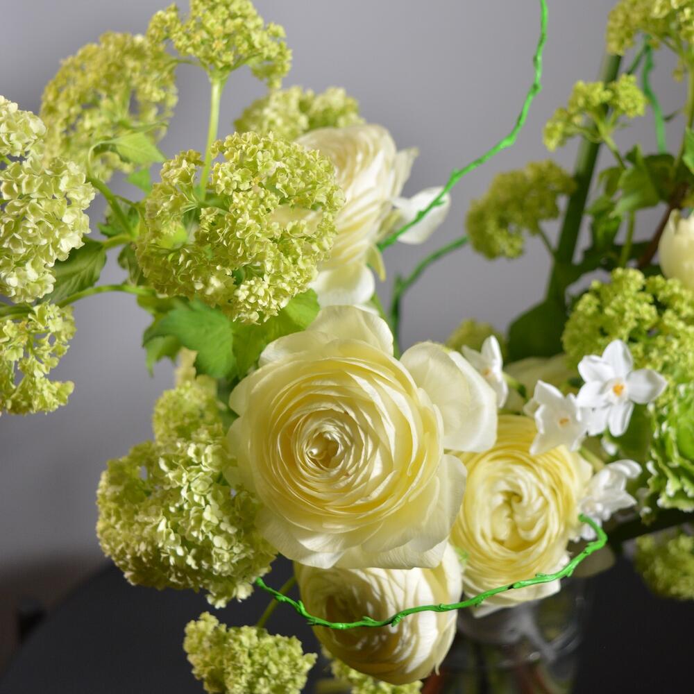 Ранункулюс – 10 шт.Вибурнум – 5 шт.Нарцисс – 5 шт.ветки декоративные – 3 шт.