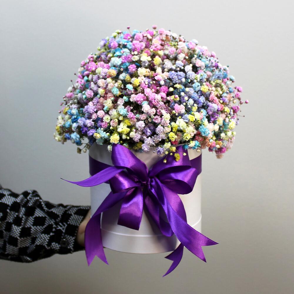 гипсофила радужная эквадор – 45 шт.Шляпная коробка – 1 шт.Оазис флористический – 1 шт.Лента атласная – 1 шт.любовь флориста (бесплатно) – 1 шт.инструкция по уходу за цветами – 1 шт.