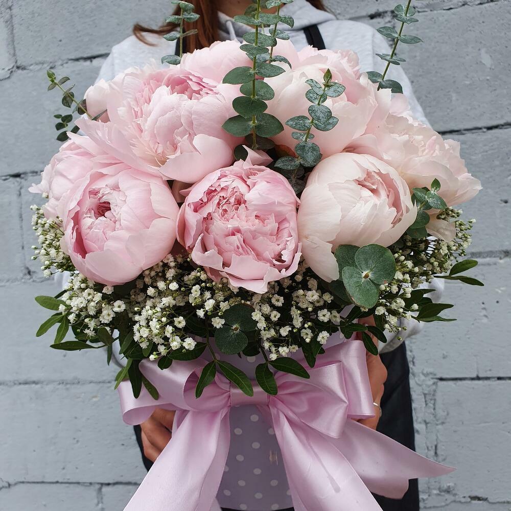 Пион – 19 шт.Эвкалипт – 5 шт.Гипсофила – 2 шт.Фисташка – 3 шт.Лента атласная – 1 шт.
