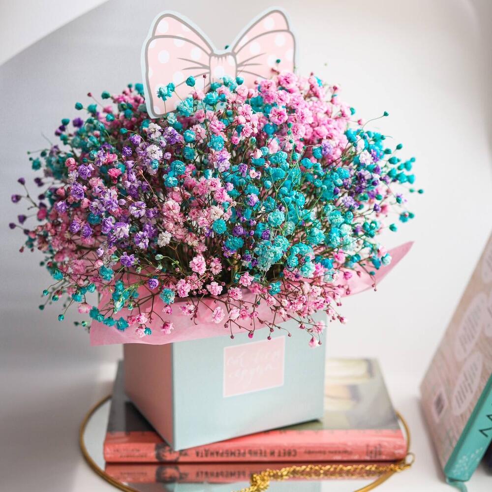 Очаровательная, воздушная композиция из гипсофилы, в коробочке .Цветы стоят в специальной флористической губке,что позволяет им больше оставаться свежими и радовать получателя. Так же композиция в коробке это очень удобно и эффектно, так как не надо ставить букет в вазу и менять воду. Необходимо лишь подливать в губку воду.Инструкция по уходу за цветами прикреплена к каждому заказу.Цветы гипсофилы отличаются стойкостью и даже при высыхании не теряют, декоративности и цвета. Что позволяет, долгое время украшать интерьер в качестве сухоцветов.Подпишем открытку с вашими пожеланиями бесплатно