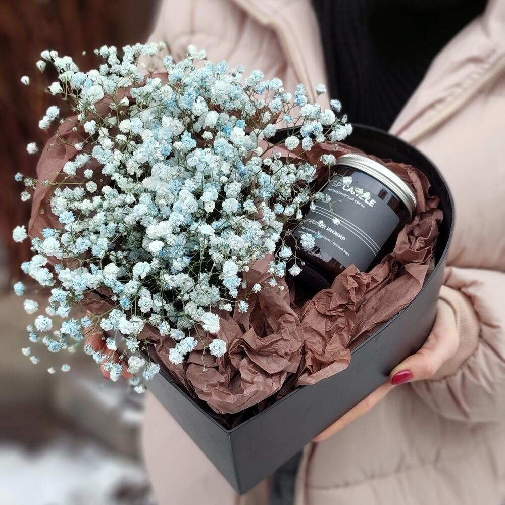 “Сиреневый туман” – композиция из гипсофилы в шляпной коробке