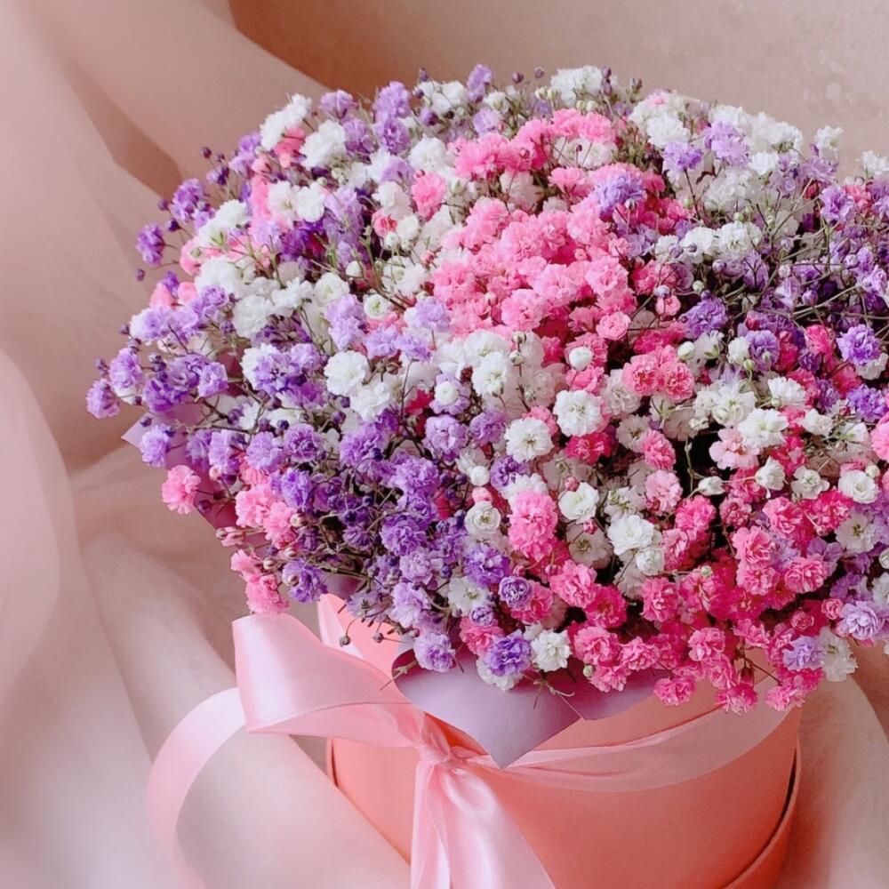 Радужная гипсофила в шляпной коробке