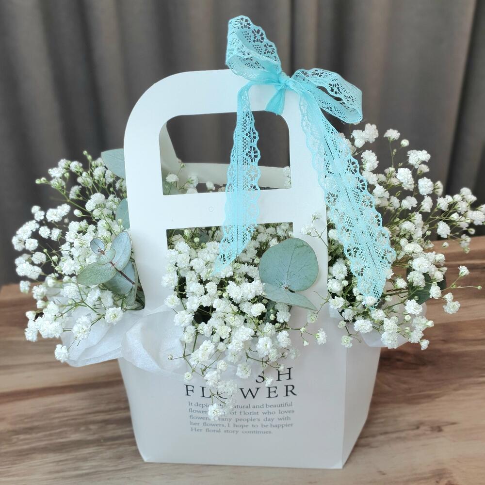 Воздушное облако белоснежной гибсофилы с ароматным эвкалиптом в стильной сумочке)))