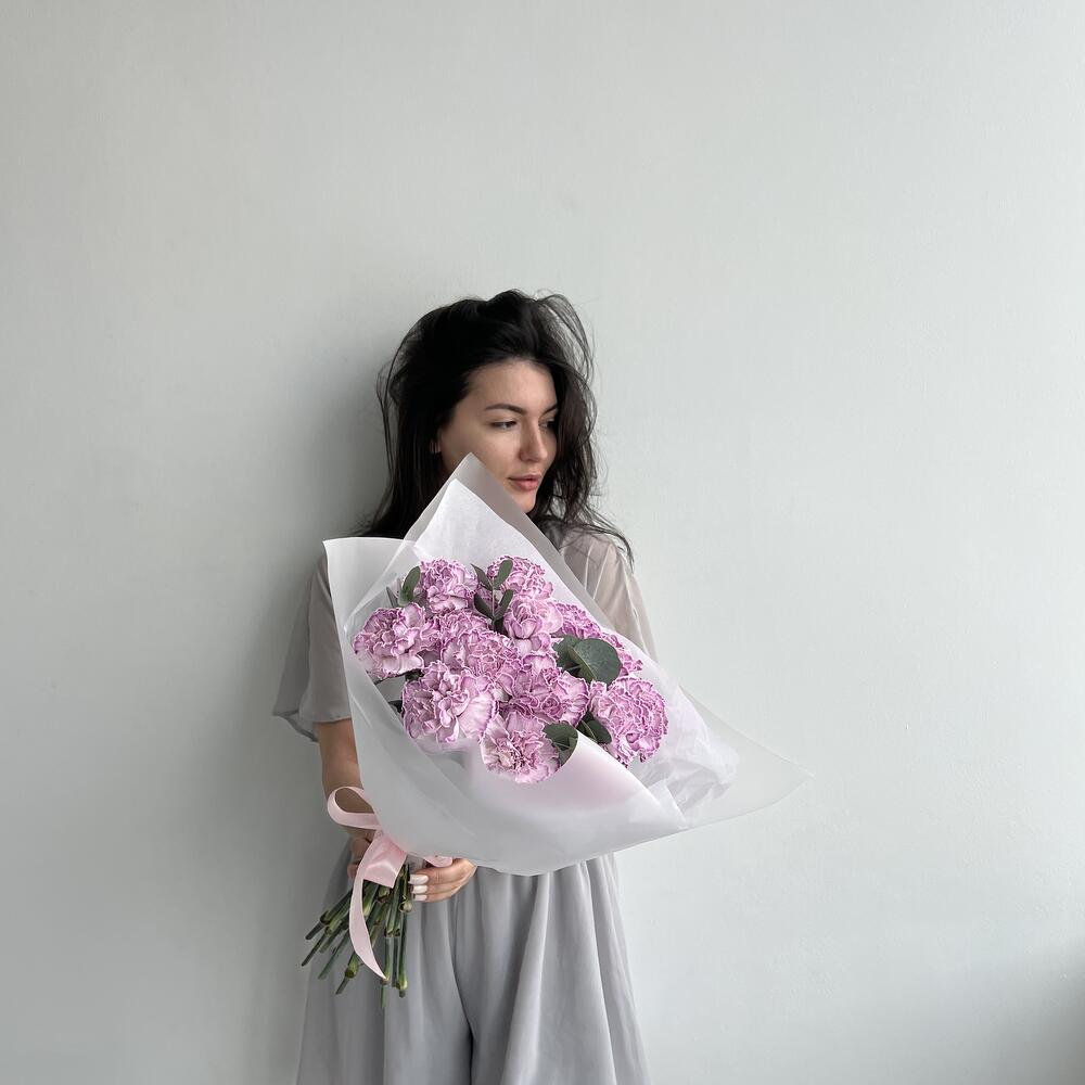 15 фиолетовых гвоздик с эвкалиптом (букет N 30)
