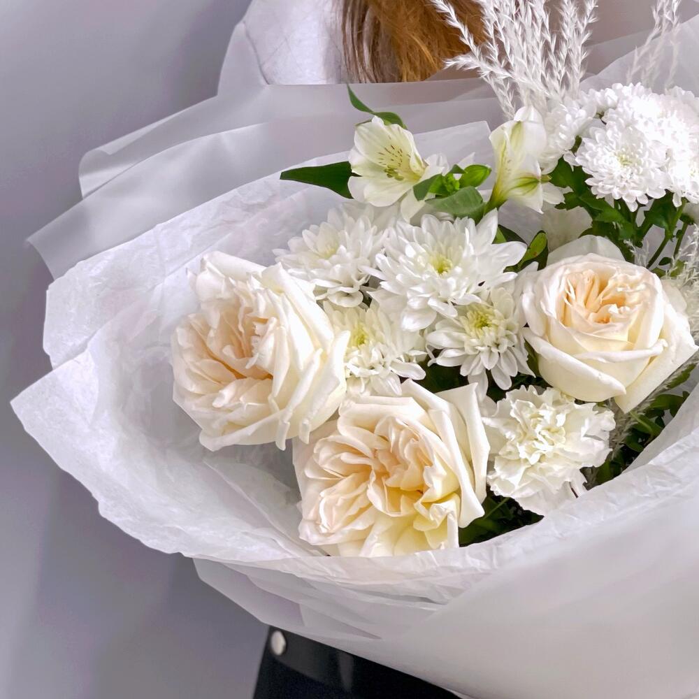 Белый букет с ароматными пионовидными розами
