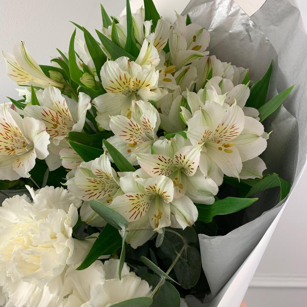 Гвоздика одноголовая – 5 шт.Альстромерия – 6 шт.Эвкалипт – 2 шт.Тишью – 1 шт.Пленка дизайнерская – 1 шт.Лента атласная – 1 шт.
