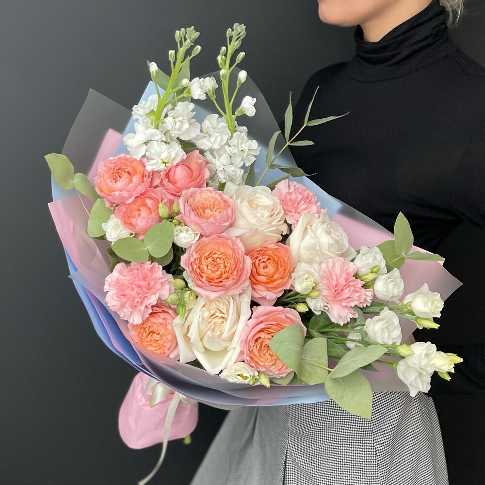 Букет из пионовидных персиковых роз и эвкалипта