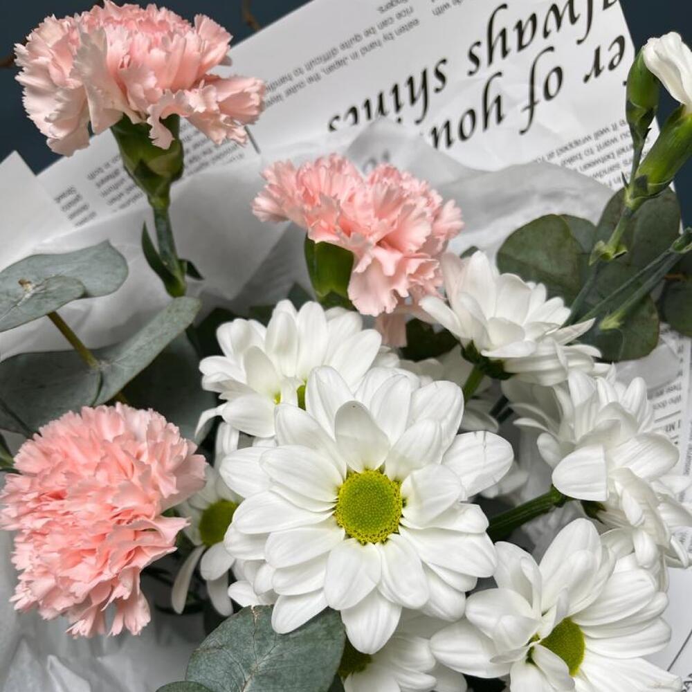 Эвкалипт – 3 шт.Кустовая хризантема – 1 шт.Гвоздика – 3 шт.Тишью – 1 шт.Кустовая гвоздика – 2 шт.Упаковка дизайнерская – 1 шт.