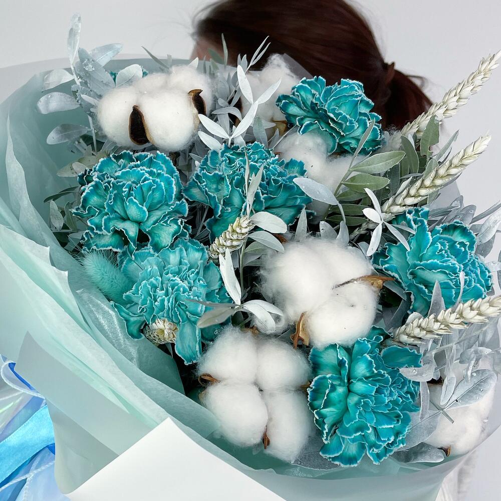 Гвоздика – 7 шт.Лента атласная – 4 шт.Фисташка – 3 шт.Пленка матовая – 4 шт.Хлопок натуральный – 5 шт.Тишью белое – 4 шт.колосок полевой – 5 шт.