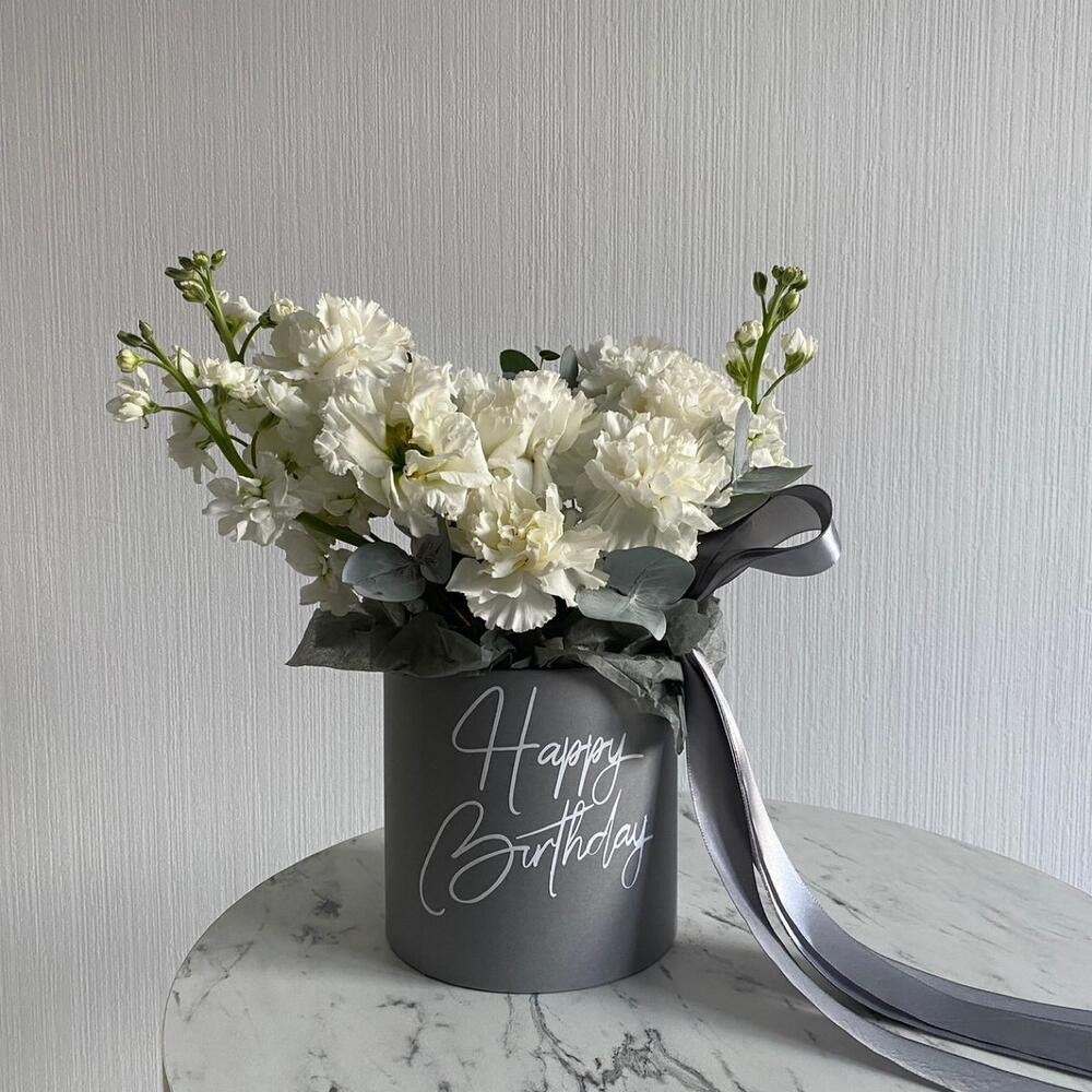 Композиция для тех кто ценит стиль и минимализм Диантусы и маттиола в шляпной коробке с надписью “Happy birthday” и пышными лентами К заказу мы добавляем инструкцию по уходу за цветами, чтобы они вас дольше радовали.Вы можете дополнить заказ воздушными шарами или … Показать ещёкоробкой сюрпризом , ознакомтесь со всем ассортиментом нашего магазина