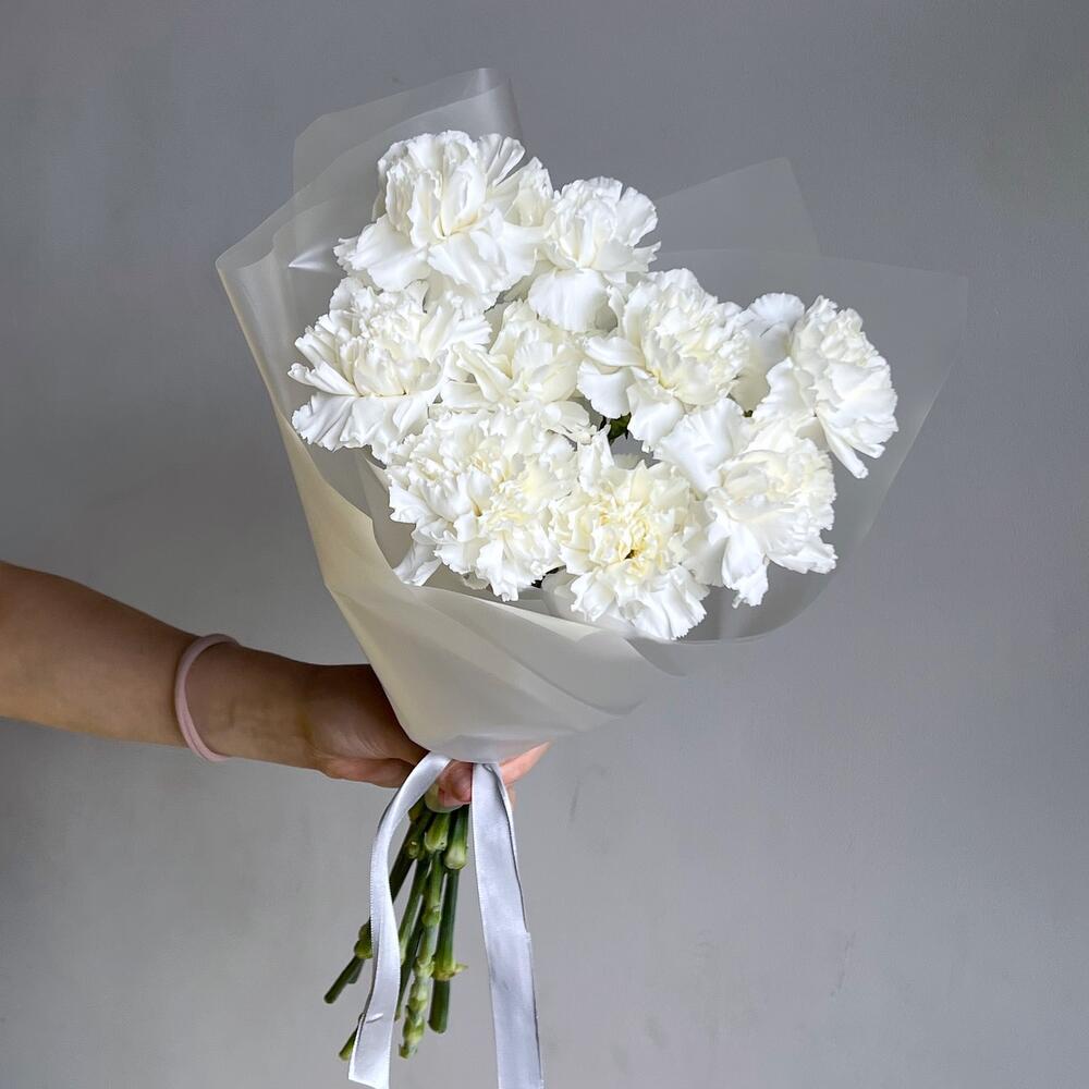 гвоздика white – 9 шт.Дизайнерская упаковка – 1 шт.Лента – 1 шт.