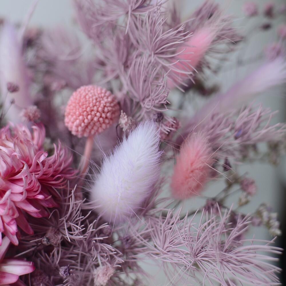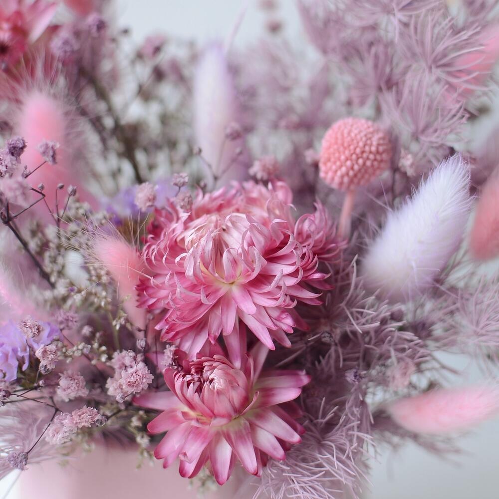 Интерьерная композиция из сухоцветов в розово-сиреневых тонах