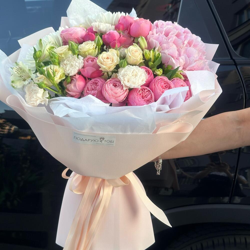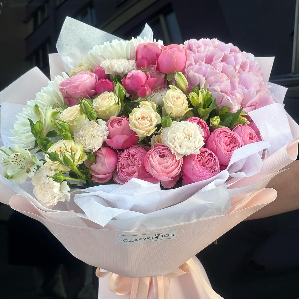 Альстромерии, Гвоздики, Кустовые розы, Лизиантусы, Розы, Хризантемы