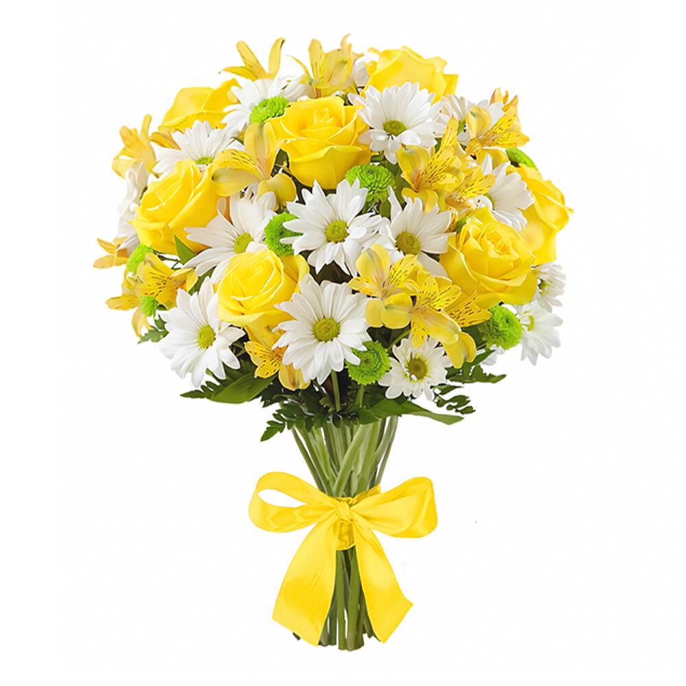 Папоротник – 1 шт.хризантема кустовая (белый) – 5 шт.альстромерия (желтый) – 5 шт.лента атласная (желтый) – 1 шт.