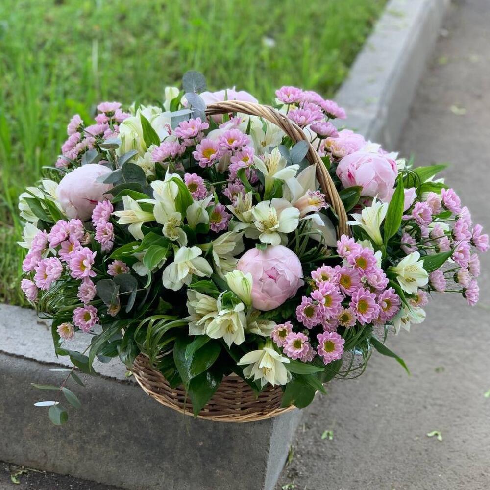 Пион Сара Бернар – 5 шт.Альстромерия – 10 шт.Сантини – 8 шт.Эвкалипт – 3 шт.Зелень – 5 шт.Корзина – 1 шт.
