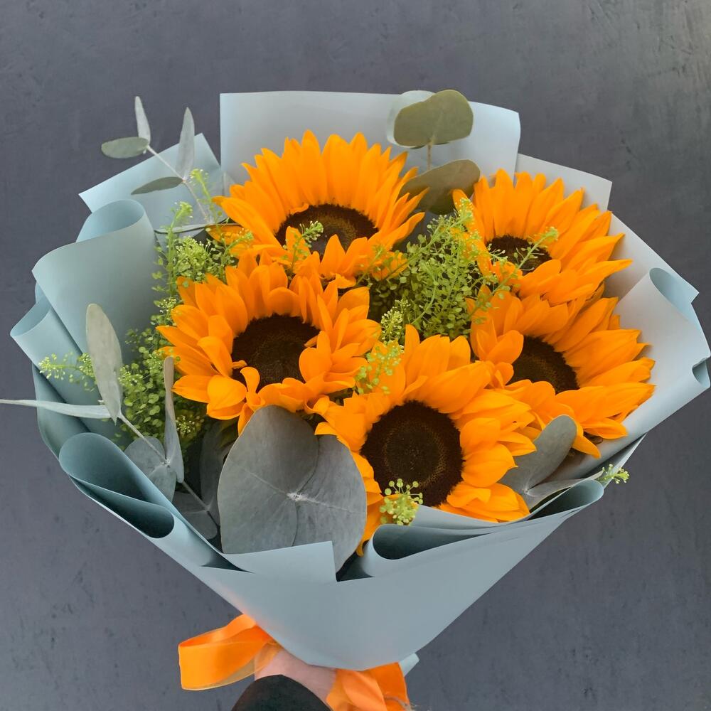 Букет из подсолнухов, тиласпии и эвкалипта Винсент