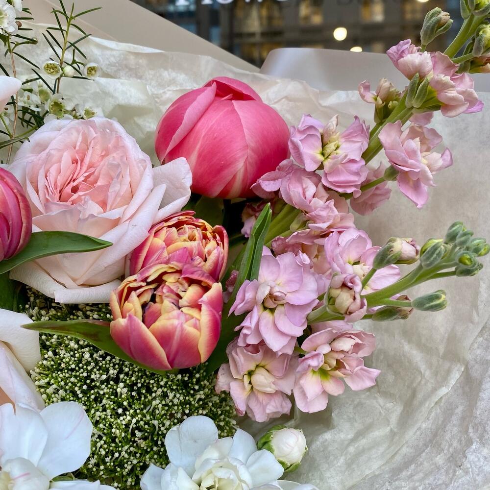 роза пинк охара(ароматная) – 3 шт.Пион Коралл Шарм (Coral Charm) – 1 шт.пионовидный тюльпан коламбус – 3 шт.Маттиола – 2 шт.Трахелиум – 1 шт.Диантус кустовой – 2 шт.Хамелациум белый – 1 шт.Упаковка дизайнерская – 3 шт.Лента атласная – 1 шт.