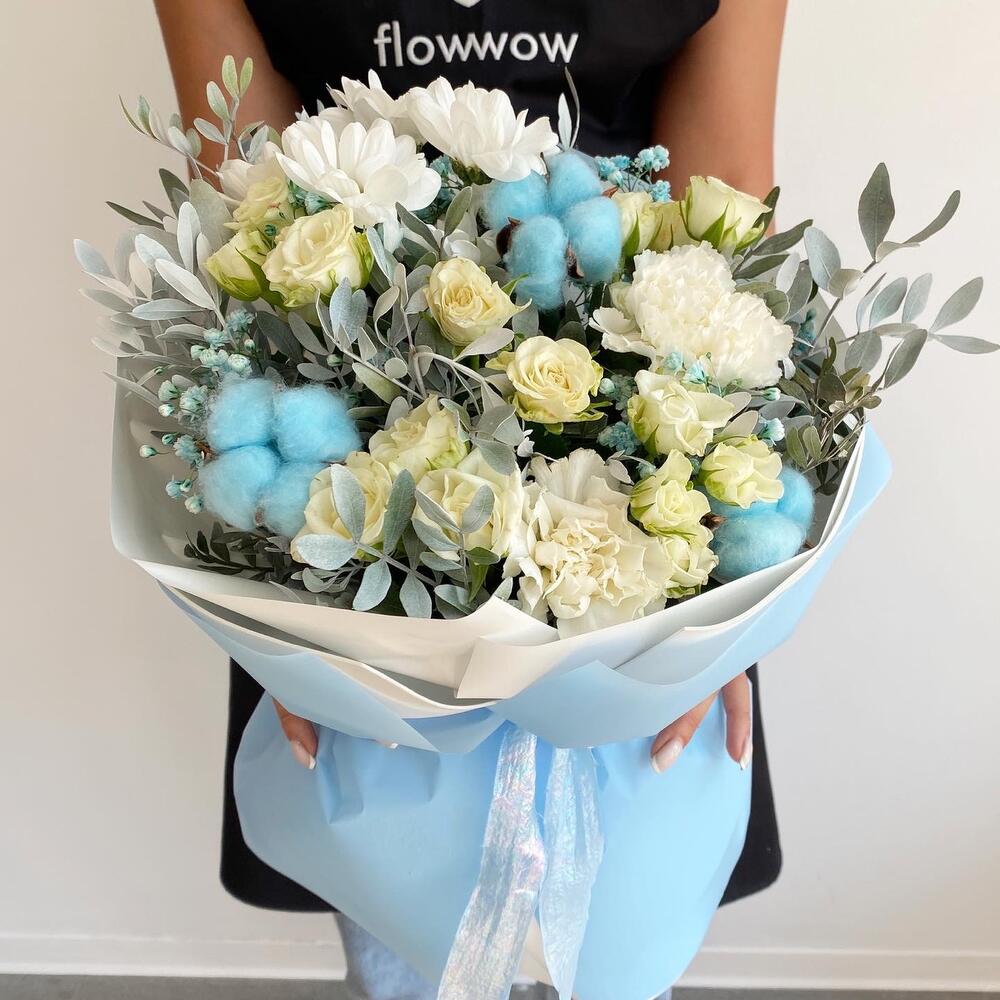 Гипсофила – 1 шт.Роза кустовая – 9 шт.Хризантема кустовая – 1 шт.Диантус – 2 шт.Упаковка дизайнерская – 2 шт.