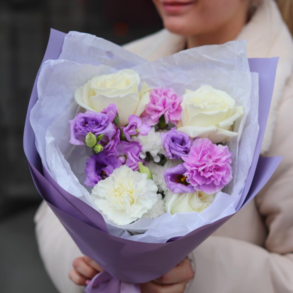 Лизиантус – 1 шт.Маттиола – 1 шт.Гвоздика – 3 шт.Сантини – 1 шт.Роза белая пионовидная – 3 шт.Открыточка с вашими пожеланиями – 1 шт.Шоколадка – 1 шт.