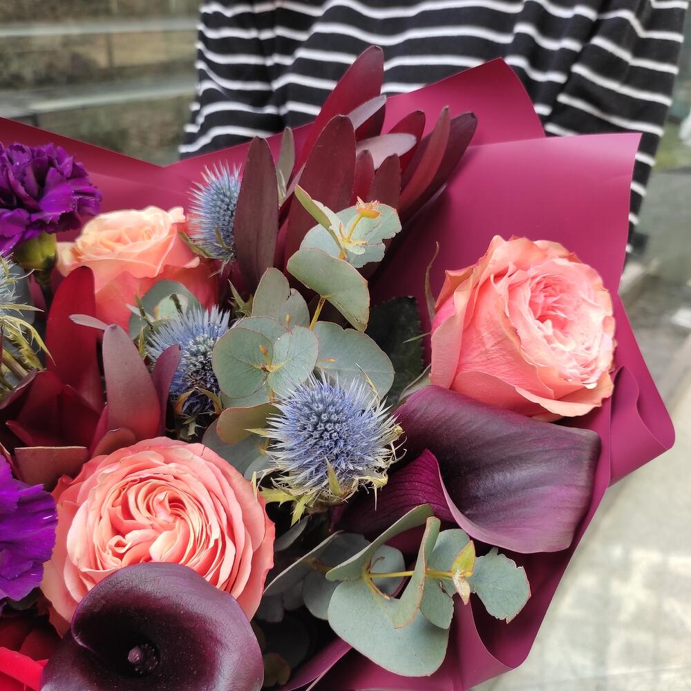 Borsch – Букет из алых роз,эрингиума и калл