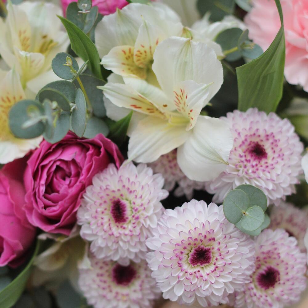 Категорий: Альстромерии, Гвоздики, Пионовидные розы, Розы, Хризантемы