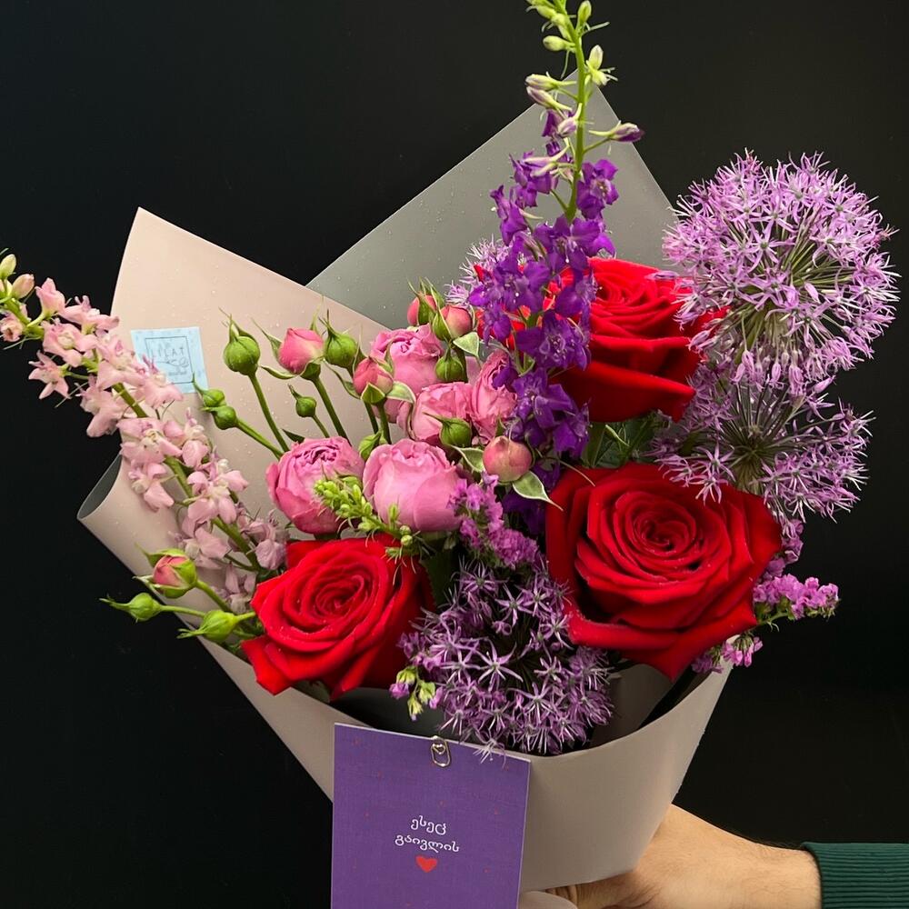 Роза Эквадор – 3 шт. Луковичные растения – 3 шт. Пионовидная кустовая роза – 1 шт. Лимониум – 2 шт. Упаковка дизайнерская – 2 шт. Открыточка с вашими пожеланиями – 1 шт. инструкция по уходу за цветами – 1 шт.