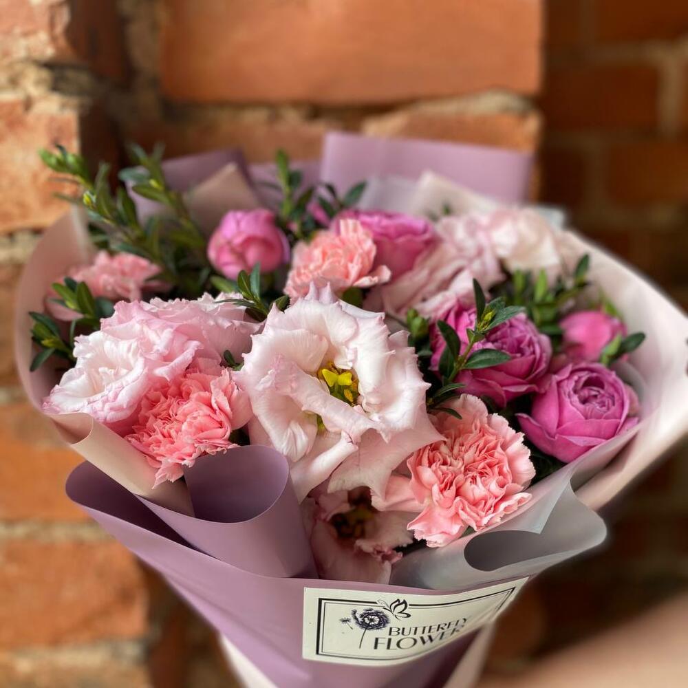Букет из эустомы, гвоздики и кустовой пионовидной розы в дизайнерской упаковке “Вишневая аллея”