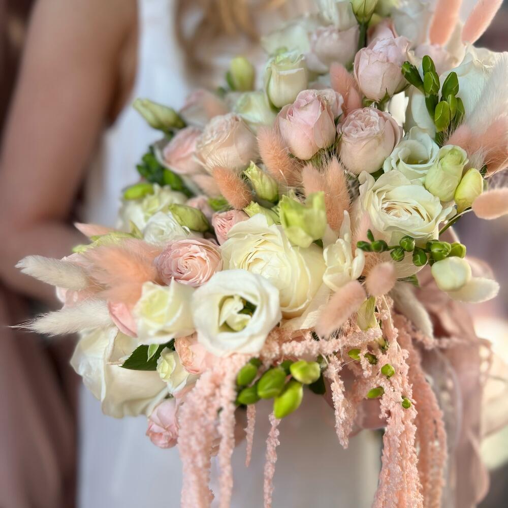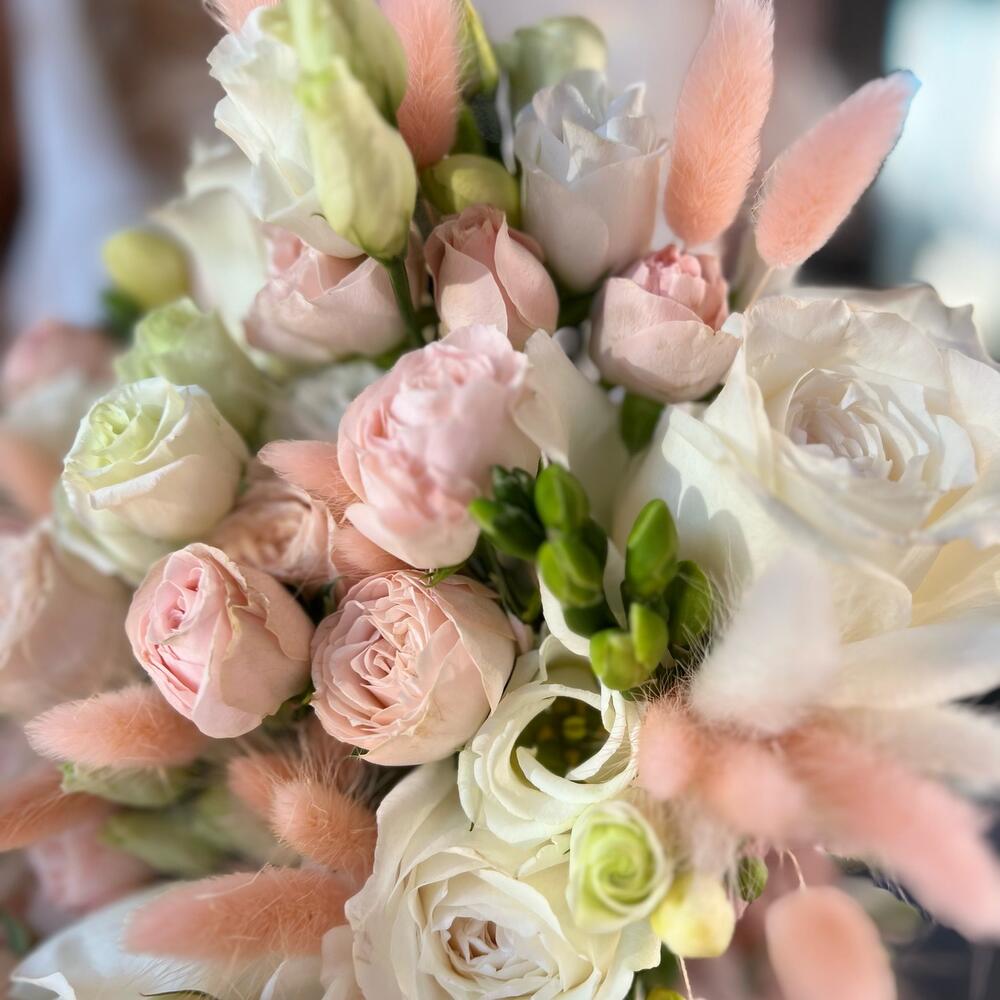 Пионовидная роза – 5 шт.Кустовая пионовидная роза – 11 шт.Лизиантус – 5 шт.фрезии – 5 шт.Лагурус – 30 шт.амарант стабилизированный – 1 шт.Лента атласная – 3 шт.
