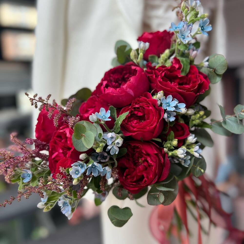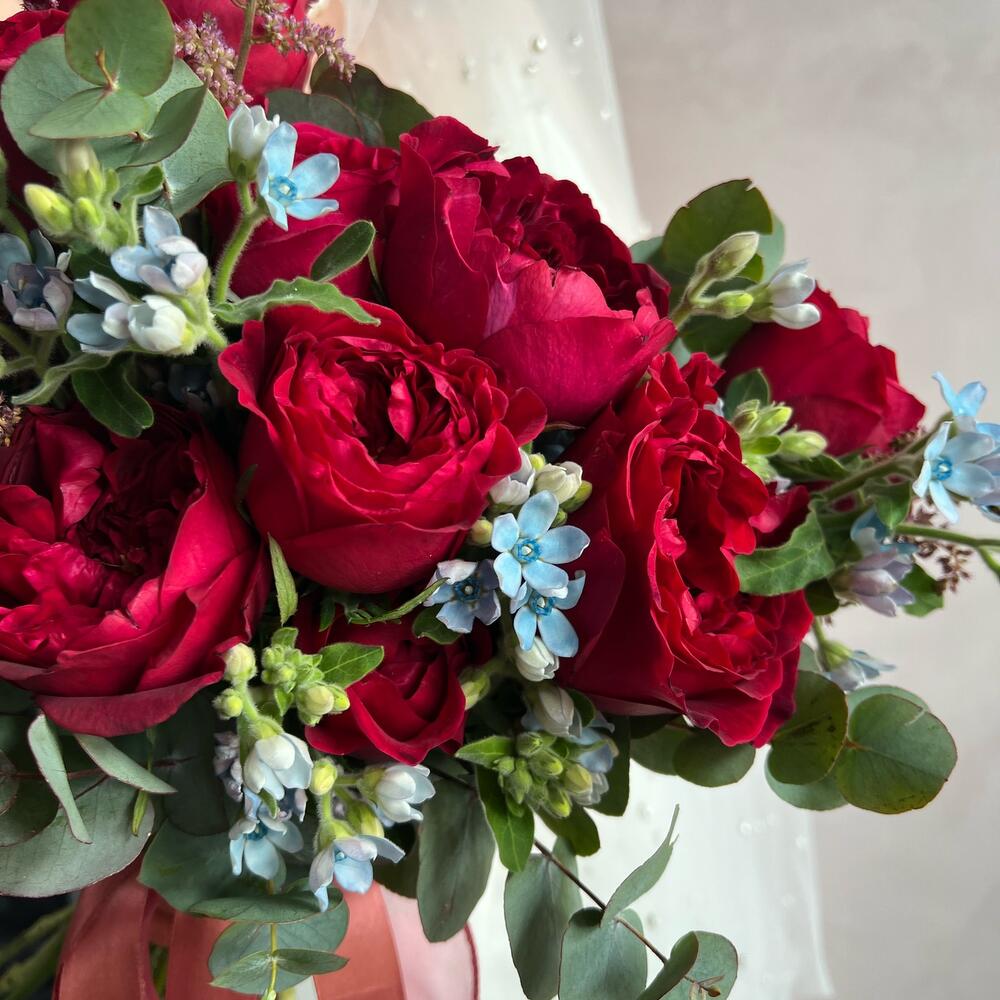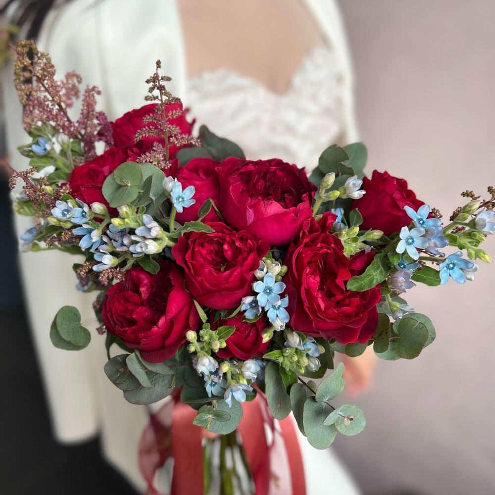 Астильба – 5 шт.Эвкалипт – 5 шт.Пионовидная роза – 9 шт.Атласная лента – 2 шт.Оксипеталум – 7 шт.