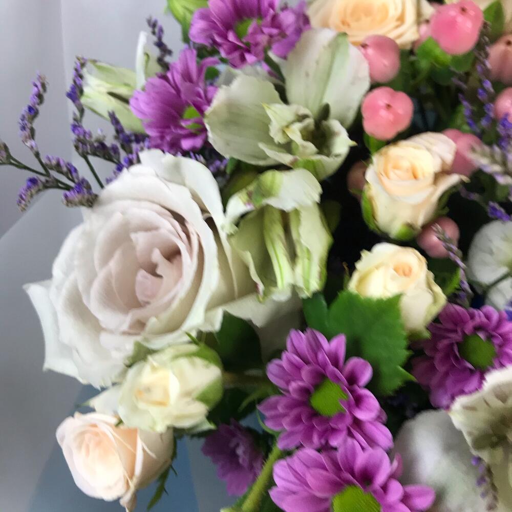 Лизиантус – 3 шт.Лимониум – 2 шт.Роза кустовая – 3 шт.Хризантема кустовая – 4 шт.Роза – 3 шт.Хиперикум – 3 шт.Упаковка дизайнерская – 2 шт.