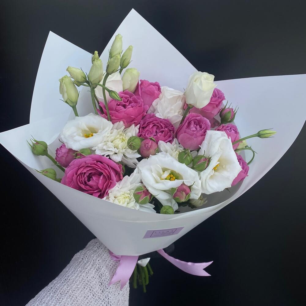 Упаковка дизайнерская – 1 шт. Открыточка с вашими пожеланиями – 1 шт. эустома белая – 3 шт. Misty Bubbles пионовидная роза – 5 шт.