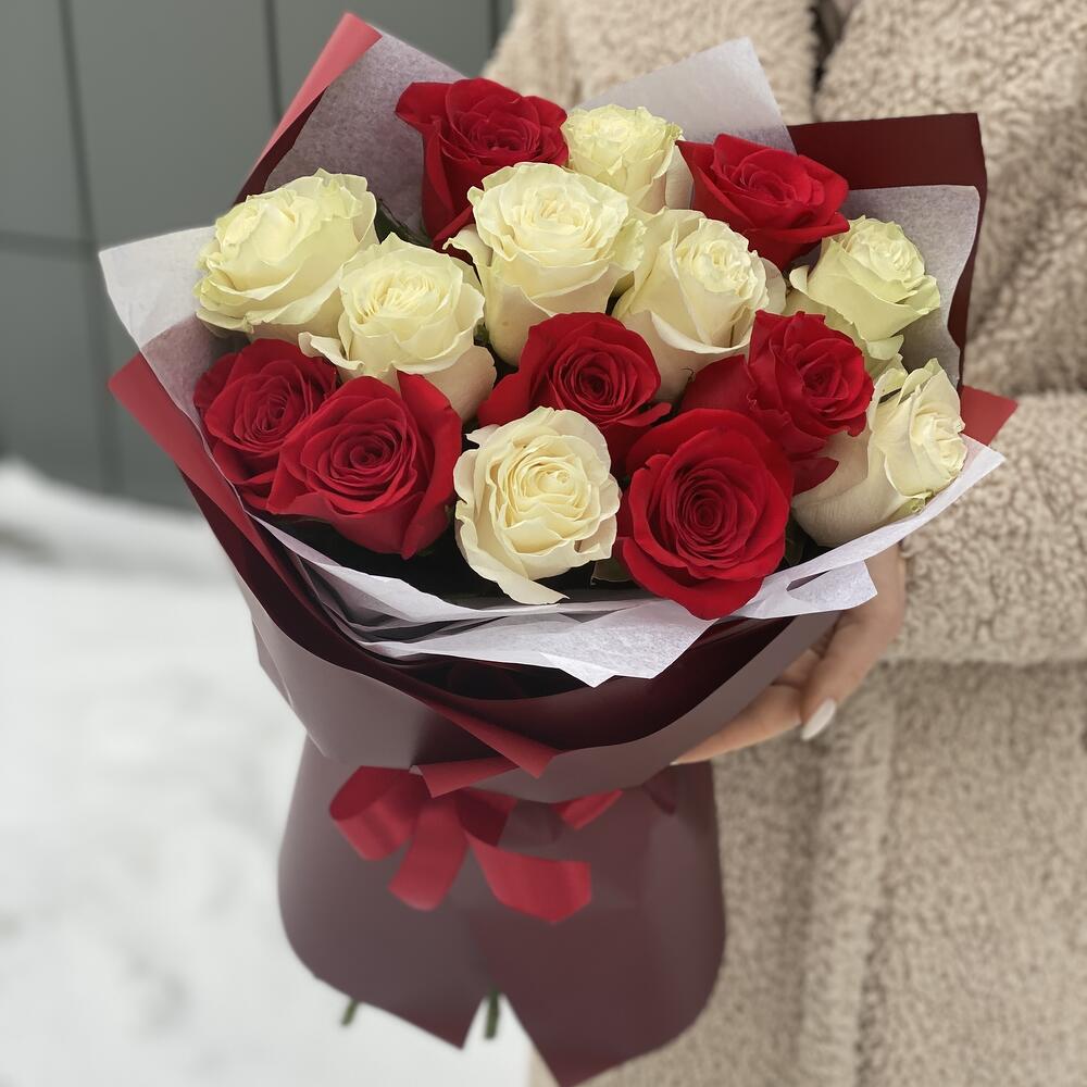 Букет Влюбленный взгляд из 15 красных и белых роз в оформлении