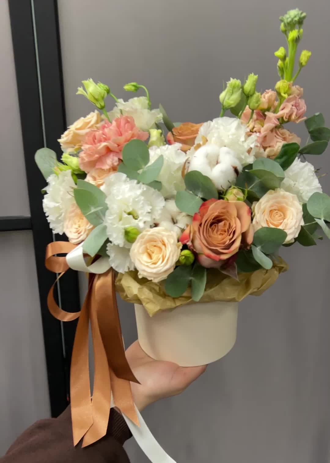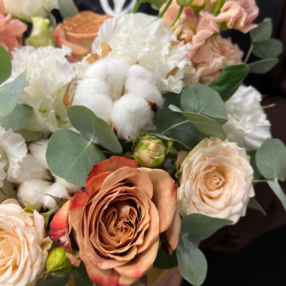 Роза Капучино – 2 шт.Хлопок – 2 шт.Эвкалипт – 2 шт.Лента атласная – 2 шт.Тишью – 1 шт.Диантус – 1 шт.Коробка шляпная – 1 шт.Оазис флористический – 1 шт.эустома махровая белая – 2 шт.Маттиола априкот – 1 шт.роза кустовая таня – 1 шт.