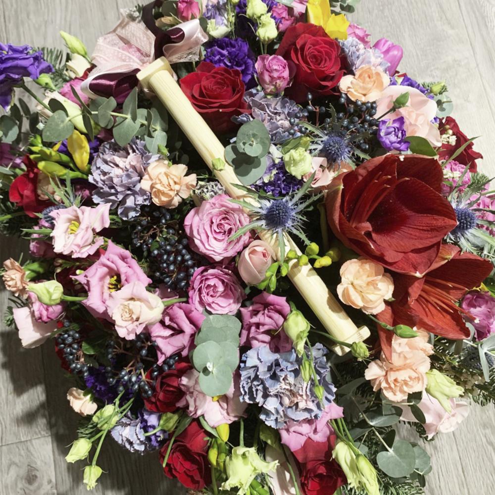 Амариллис – 1 шт.Роза красная премиум – 9 шт.роза кустовая “леди бумбастик” – 7 шт.Вибурнум ягоды – 3 шт.Эрингиум – 3 шт.Роза персиковая – 6 шт.Диантус премиум – 10 шт.эустома “алиса пинк” – 6 шт.эустома “алиса блю” – 6 шт.Диантус кустовой – 9 шт.Фрезия желтая – 6 шт.Тюльпан розовый – 6 шт.эвкалипт (пучок) – 1 шт.нобилис (голубая ель) ветка – 3 шт.
