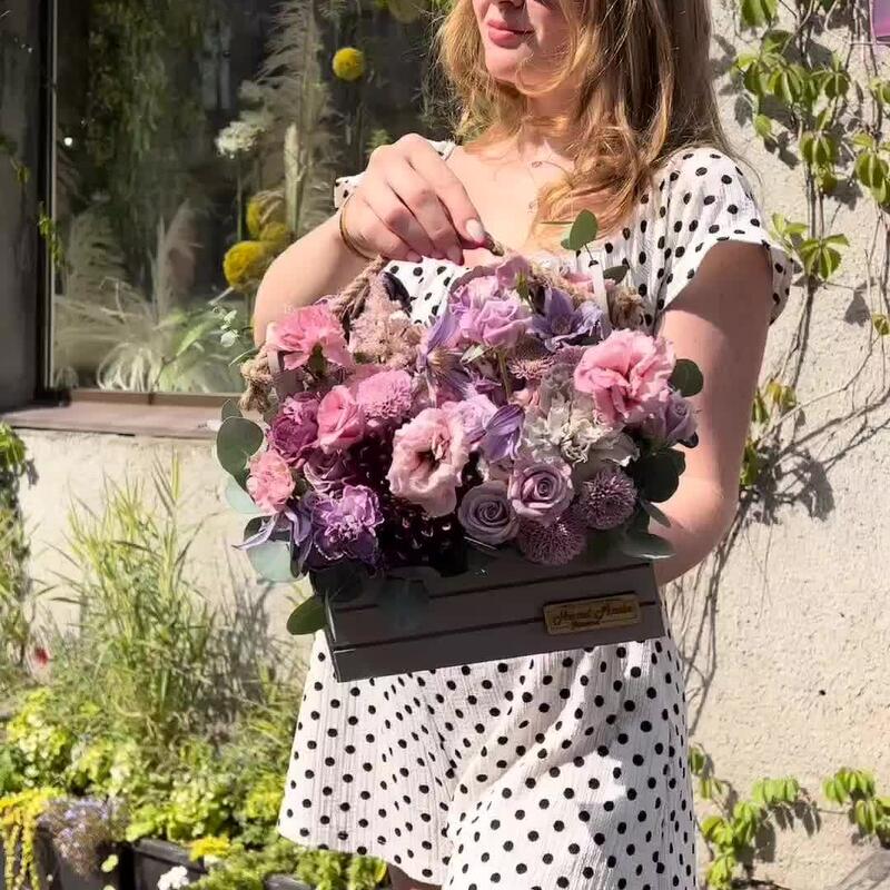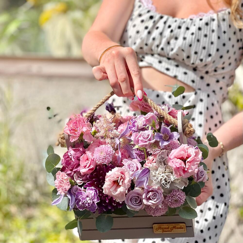 Роза – 3 шт.Лизиантус – 3 шт.Сантини – 2 шт.Астильба – 1 шт.Диантус – 7 шт.цветы микс – 5 шт.зелень декоративная – 5 шт.Эвкалипт – 1 шт.Клематис – 1 шт.Ящик деревянный – 1 шт.Флористическая губка – 1 шт.