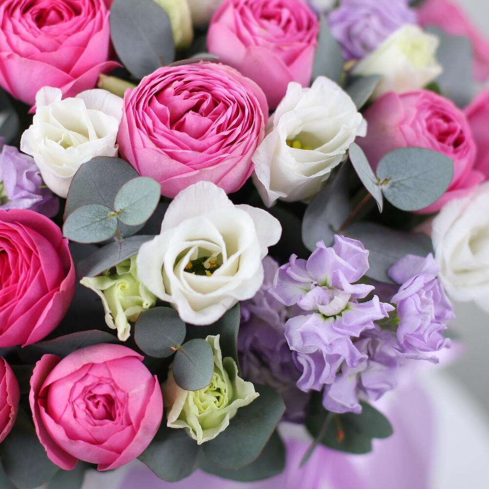 Пионовидная кустовая роза – 10 шт.Маттиола лавандовая – 10 шт.Эустома – 6 шт.Шляпная коробка – 1 шт.Губка флористическая – 1 шт.Атласная лента – 1 шт.Эвкалипт – 10 шт.