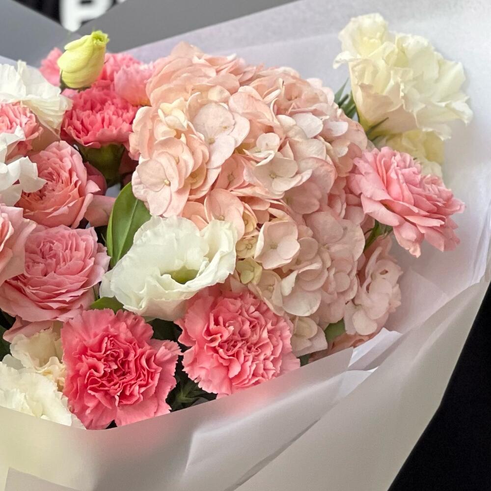 Евро-Букет из Гортензии ,Пионовидных кустовых роз,Диантусов и Лизиантусов