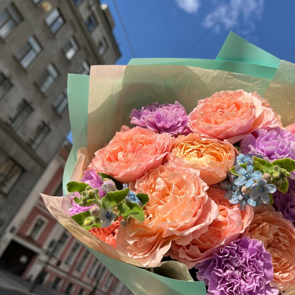 роза пионовидная премиум джульетта – 5 шт.Диантус лунный – 6 шт.твидия голубая – 3 шт.тишью крафтовое – 1 шт.упаковка корейская пленка тиффани – 1 шт.Лента атласная – 1 шт.
