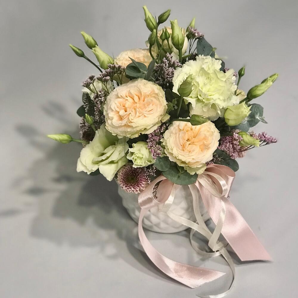 Кашпо керамическое – 1 шт.Оазис флористический – 1 шт.Роза кустовая пионовидная – 1 шт.Сантини – 1 шт.Лимониум – 1 шт.Гвоздика – 1 шт.Лизиантус – 1 шт.Эвкалипт – 1 шт.Лента – 1 шт.