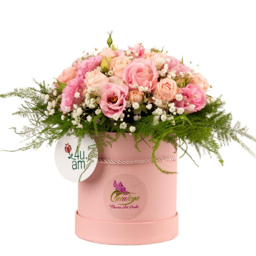 Цветы: кустовая роза, лизиантус, гипсофилия.