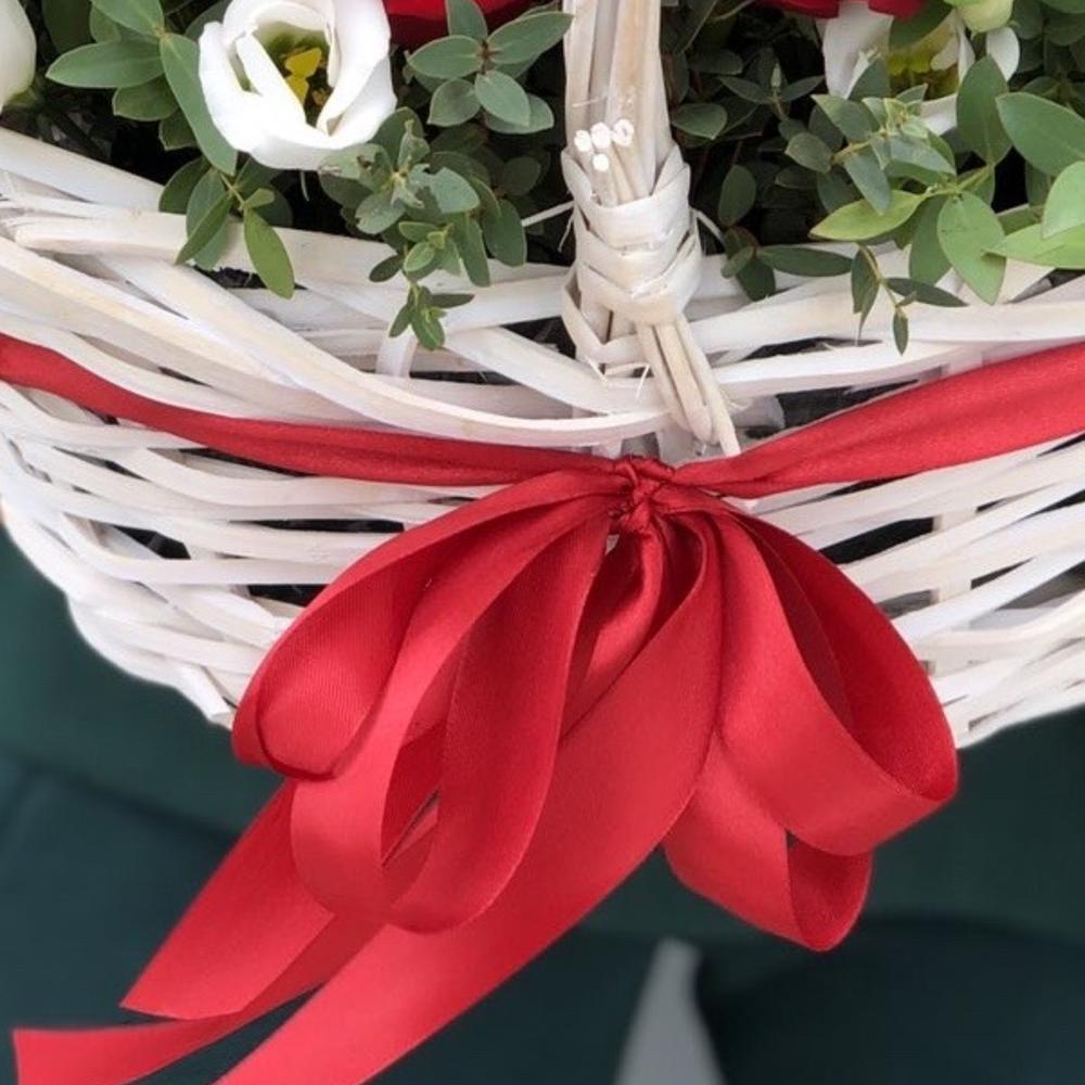 Эустома – 4 шт. Эвкалипт – 3 шт. красная роза фридом – 11 шт. Корзина – 1 шт. Оазис – 2 шт. Оформление – 1 шт.