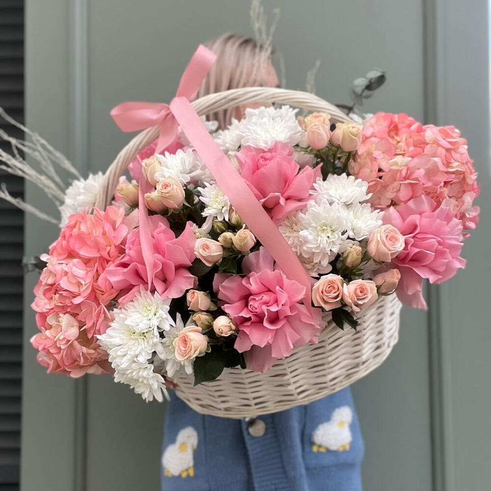 Альстромерии, Гортензии, Кустовые розы, Лизиантусы, Розы, Хризантемы