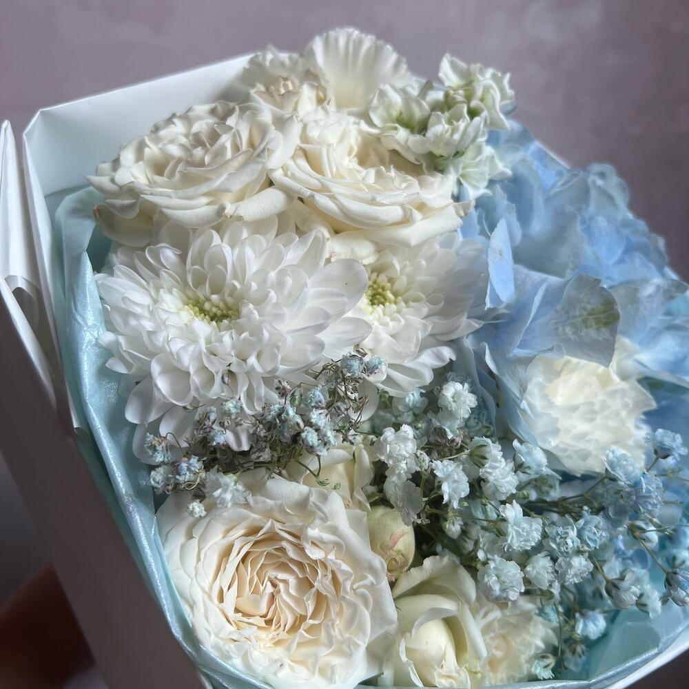 Гортензия – 1 шт.Гвоздика – 2 шт.Кустовая роза – 2 шт.Хризантема – 1 шт.Гипсофила – 1 шт.Маттиола – 1 шт.декоративная упаковка – 1 шт.Атласная лента – 1 шт.
