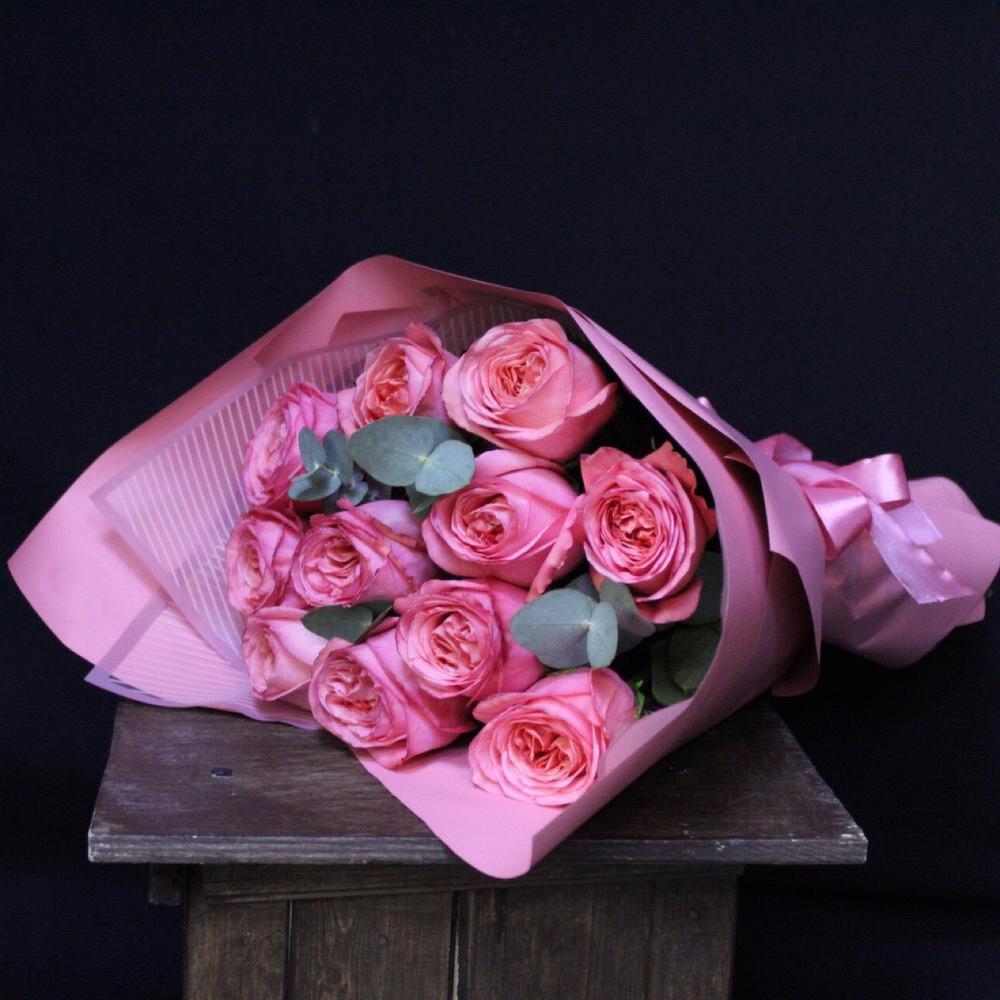роза пионовидная пинк экспрешн – 11 шт.Эвкалипт – 3 шт.Пленка дизайнерская – 3 шт.Лента атласная – 2 шт.