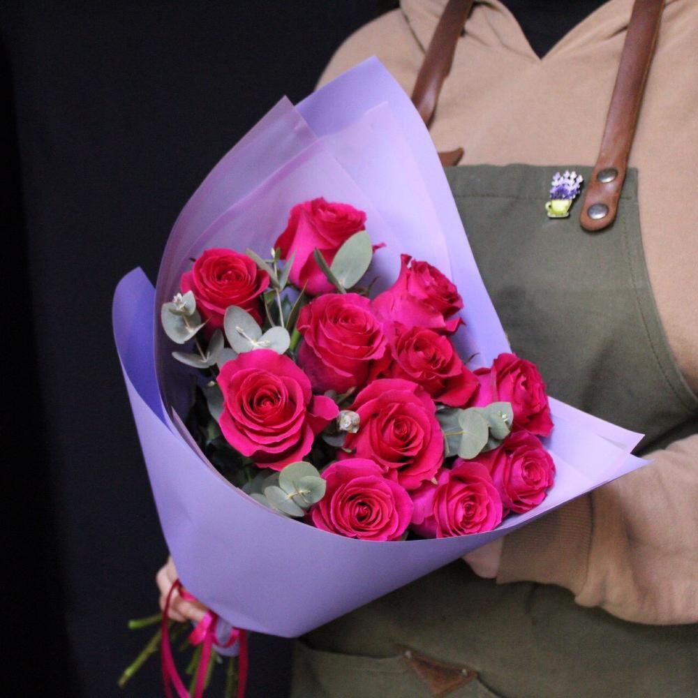 роза эквадор готча – 11 шт.Эвкалипт – 3 шт.Пленка дизайнерская – 3 шт.Лента атласная – 1 шт.