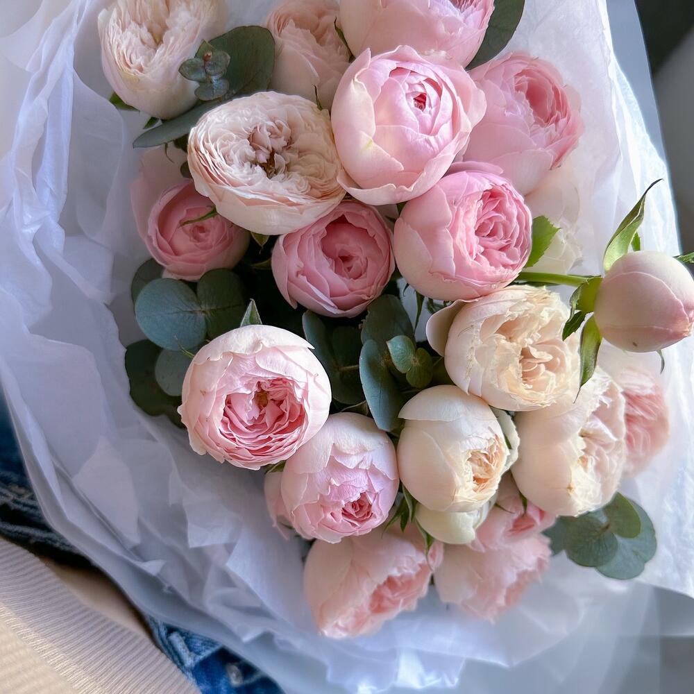 кустовая пионовидная роза мэнсфилд парк – 5 шт.Эвкалипт – 3 шт.Упаковка дизайнерская – 1 шт.