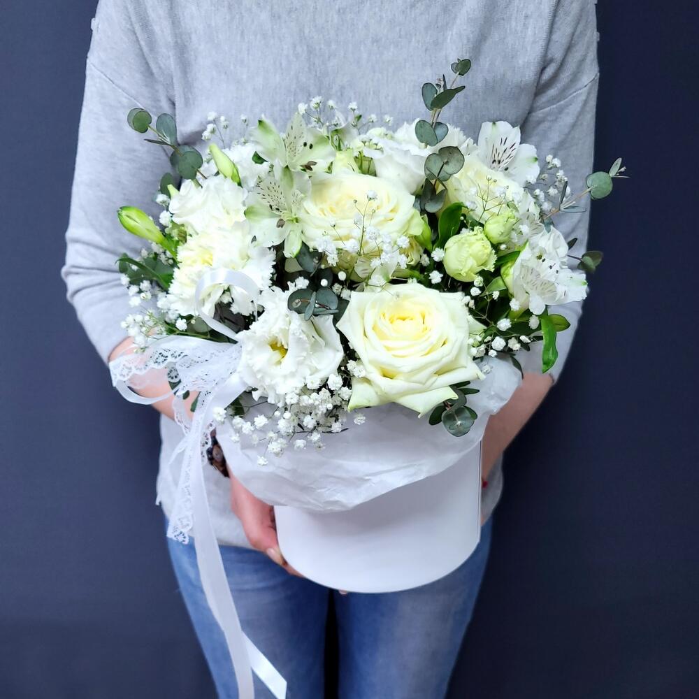 Альстромерия – 3 шт.Гипсофила – 1 шт.Лизиантус – 1 шт.Гвоздика – 3 шт.Роза белая – 3 шт.