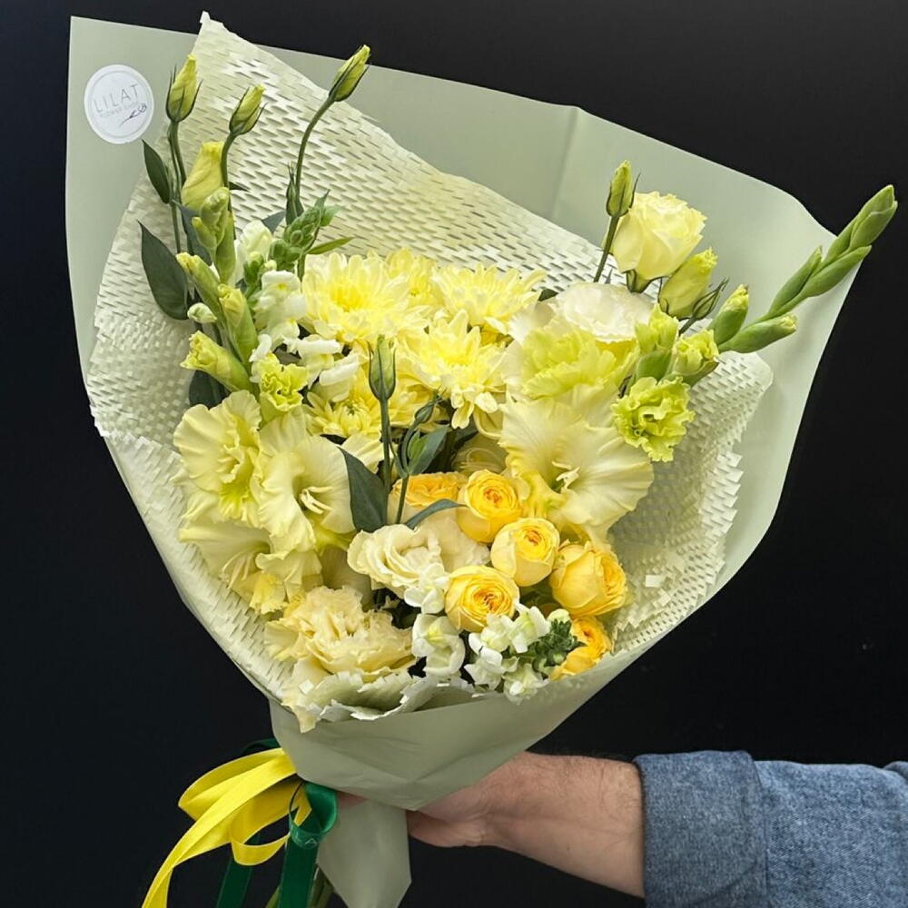 Лизиантус – 3 шт. Кустовая роза – 3 шт. Хризантема кустовая – 3 шт. Гладиолус – 3 шт. Упаковка дизайнерская – 3 шт. Открыточка с вашими пожеланиями – 1 шт.